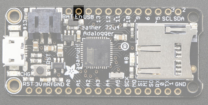 You have a lot of power supply options here! We bring out the BAT pin, which is tied to the lipoly JST connector, as well as USB which is the 5V from USB if connected. We also have the 3V pin which has the output from the 3.3V regulator. We use a 500mA peak SPX3819. While you can get 500mA from it, you can't do it continuously from 5V as it will overheat the regulator. It's fine for, say, powering an ESP8266 WiFi chip or XBee radio though, since the current draw is 'spiky' & sporadic.