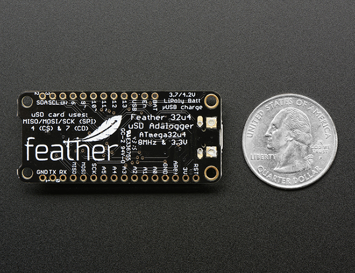This is the Adafruit Feather 32u4 Adalogger - our take on an 'all-in-one' datalogger (or data-reader) with built in USB and battery charging. Its an Adafruit Feather 32u4 with a microSD holder ready to rock!