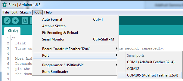 Plug in the Feather 32u4 and wait for it to be recognized by the OS (just takes a few seconds). It will create a serial/COM port, you can now select it from the dropdown, it'll even be 'indicated' as Feather 32u4!
