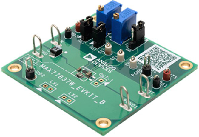 The MAX77837EVKIT evaluation kit (EV kit) is a fully assembled and tested printed circuit board (PCB) demonstrating the MAX77837 nanoPower buck-boost converter. The EV kit has an input range of 1.8 V to 5.5 V, with a switch current limit of 1.05 A.