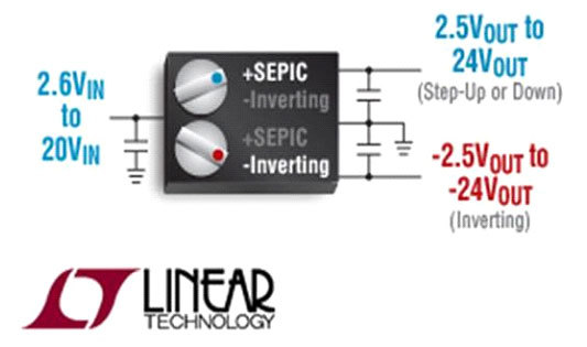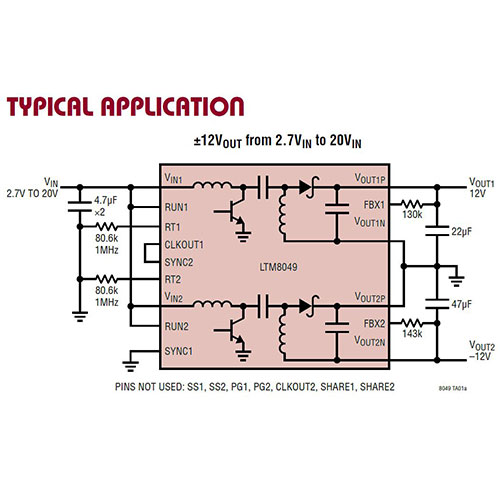 Analog Devices' LTM8049 is a dual-SEPIC/inverting μModule (power module) DC/DC converter. Each of the two outputs can be easily configured as a SEPIC or inverting converter by simply grounding the appropriate output rail. The LTM8049 includes power devices, inductors, control circuitry, and passive components. All that is needed to complete the design are input and output caps, and small resistors to set the output voltages and switching frequency. Other components may be used to control the soft-start and undervoltage lockout.