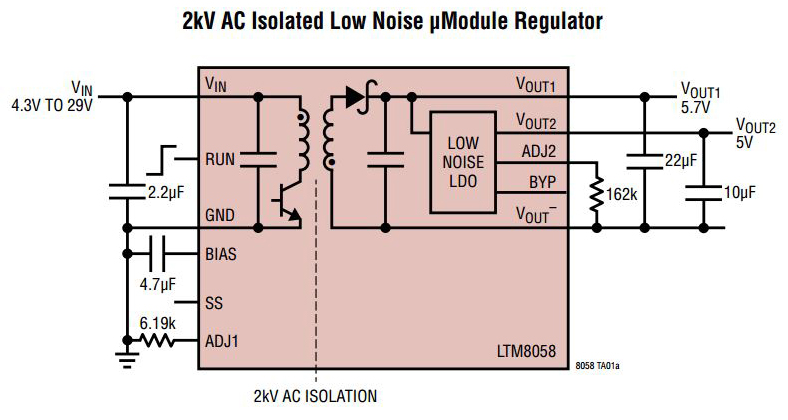 Analog Devices' LTM8057 and LTM8058 are the follow-up isolated micromodule converters to the LTM8047 and LTM8048. These converters utilize the flyback architecture which supports regulation of an output voltage above, below, or equal to the input voltage. While these devices share many similar characteristics, the LTM8057 and LTM8058 have three distinct differences: higher isolation voltage up to 2 kVAC or 3 kVDC compared to 500 VAC or 725 VDC, UL recognition which the LTM8047 and LTM8048 do not have, and a working voltage up to 250 V (that is the constant difference in electrical potential between the primary and secondary side) which is not applicable without recognition to an industry safety standard such as UL.