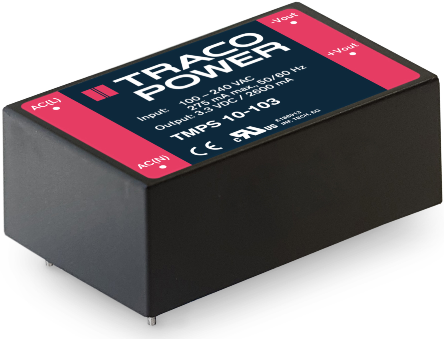 Traco Power's TMPS 10 ultra-compact power supply modules are fully encapsulated in a plastic casing for PCB mount applications. These 10 W modules are designed for low power applications or stand-by power circuits of larger systems (130% peak currents facilitate increased loads during activation of system level circuits). No load power consumption of 0.15 W max (ERP ready) and EN60335-1 approval make these ideal for IoT, building/home automation, and industrial applications.