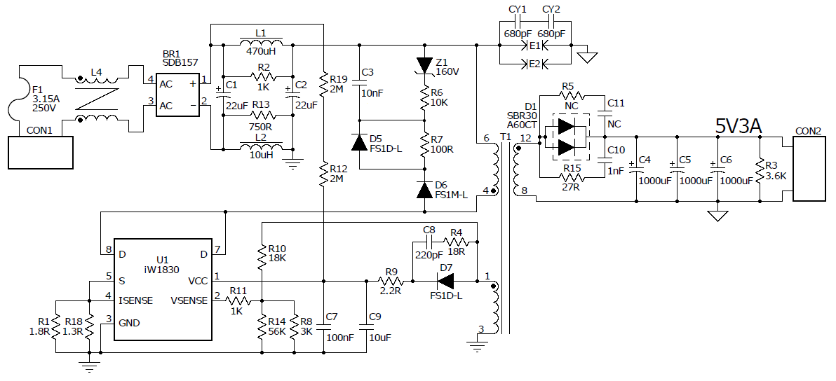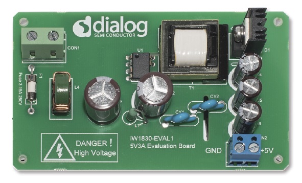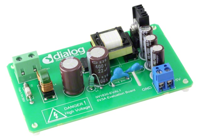 The iW1830-EVAL1 evaluation board implements a 15W power supply based on Dialog Semiconductor's iW1830 AccuSwitch™ digital offline power supply controller IC. The evaluation board supplies a 5V, 3A regulated output voltage using a primary-side controlled quasi-resonant flyback converter that meets the U.S. Department of Energy's most recent level VI efficiency standard and the EU's Code of Conduct, Version 5, Tier 2 standard for both active mode and no-load standby power consumption.