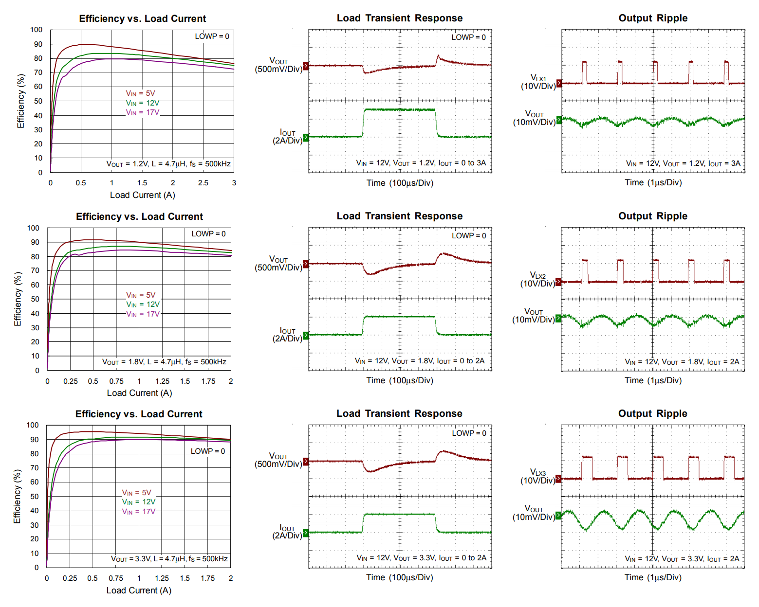 >85%, 12V in, 1.8V @ 0.5 ~ 1.5 A >80%, 12V in, 1.2V @ 0.5 ~ 2 A |