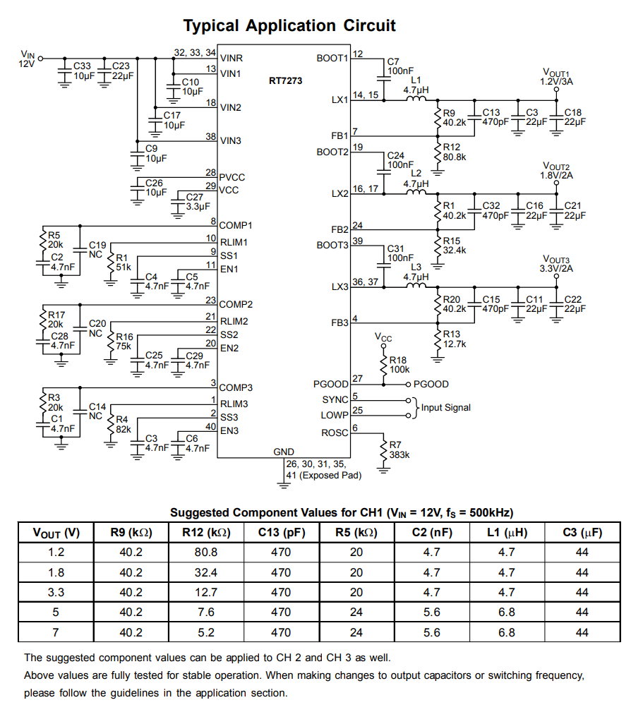 The switching frequency of the converters can either be set with an external resistor connected to ROSC pin or be synchronized to an external clock connected to SYNC pin if needed. The switching converters are designed to operate from 300kHz to 2.2MHz. The converters operate with 180° phase between CH 1 and CH 2, CH 3 (CH 2 and CH 3 ran in phase) to minimize the input filter requirements. The RT7273 also features a low power mode enabled by an external signal, which allows for a reduction on the input power supplied to the system when the host processor is in stand-by (low activity) mode.