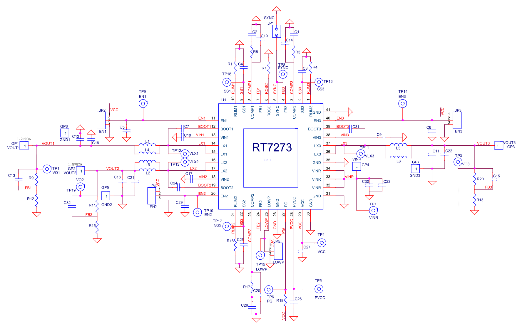 The RT7273 features three synchronous wide input range high efficiency Buck converters. The converters are designed to simplify its application while giving the designer the option to optimize their usage according to the target application. The converters can operate in 5V, 9V or 12V systems and have integrated power transistors. The output voltage can be set externally using a resistor divider to any value between 0.8V and the input supply minus 1V.