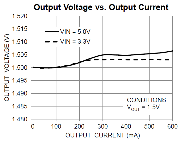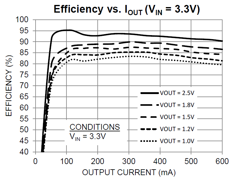 >90%, 3.3V in, 2.5V @ 50 ~ 600 mA >86%, 3.3V in, 1.8V @ 90 ~ 600 mA >85%, 5V in, 2.5V @ 170 ~ 600 mA >84%, 3.3V in, 1.5V @ 95 ~ 600 mA >82%, 3.3V in, 1.2V @ 90 ~ 600 mA >81%, 5V in, 1.8V @ 200 ~ 600 mA >80%, 3.3V in, 1.0V @ 95 ~ 550 mA >78%, 5V in, 1.5V @ 160 ~ 600 mA >76%, 5V in, 1.2V @ 140 ~ 600 mA >75%, 5V in, 1.0V @ 260 ~ 600 mA |
