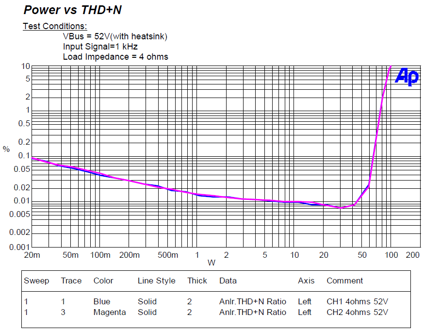 < 1% @ 75W (4 Ω, w/ Heatsink) < 10% @ 100W (4 Ω, w/ Heatsink) < 10% @ 60W (4 Ω, w/o Heatsink) |