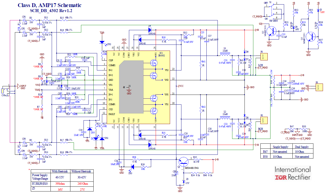 The IRAUDAMP17 reference design is a two-channel, 100W/ch (4Ω / 52V Bus voltage) half-bridge Class D audio power amplifier with single power supply. This reference design demonstrates how to use the IR4302 IC with single power supply, implement protection circuits, and design an optimum PCB layout using PowIRaudio integrated Class D IC.