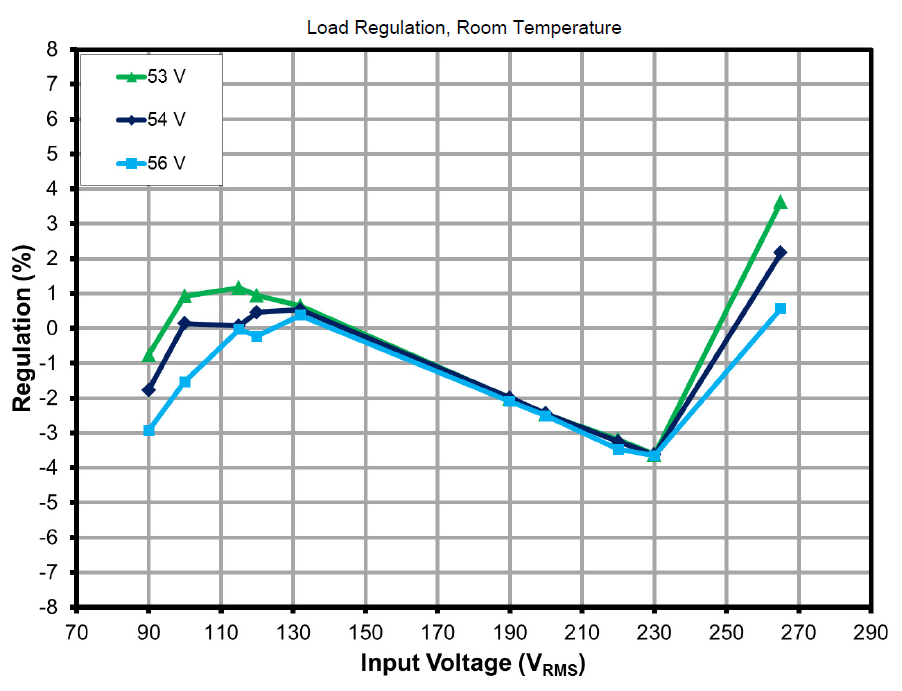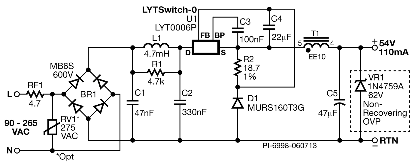 This power supply operates over an input voltage range of 90 VAC to 264 VAC. The DC bus voltage is high enough to support a 54 V output when using a buck topology. In a buck converter the output voltage must always be lower than the input voltage. The output voltage is also limited by the maximum duty cycle of the LYTSwitch-0, which also requires the input voltage to be larger than the output voltage.
