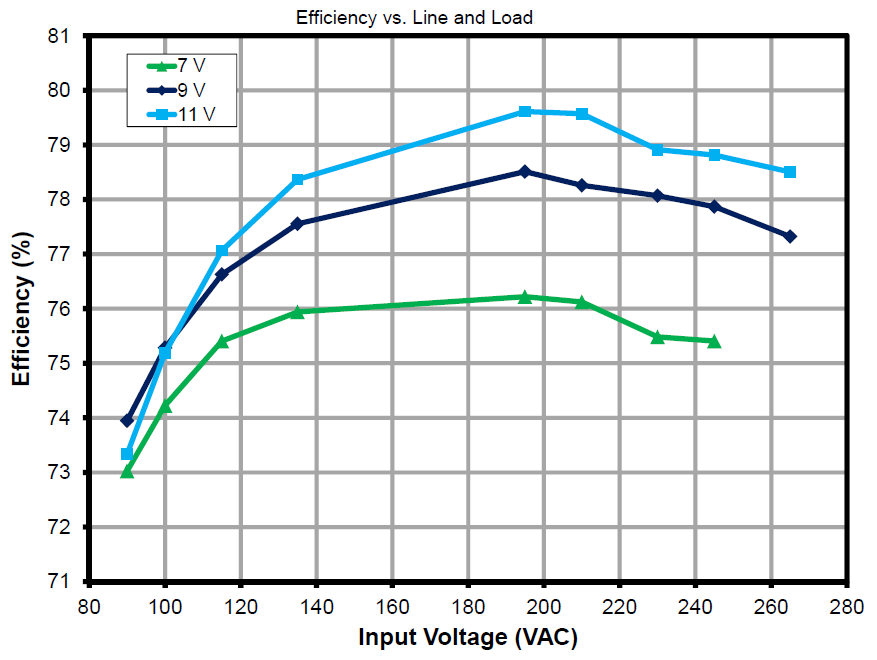 >77%, 122 ~ 265 VAC, @ 9 V >75%, 110 ~ 245 VAC, @ 7 V |