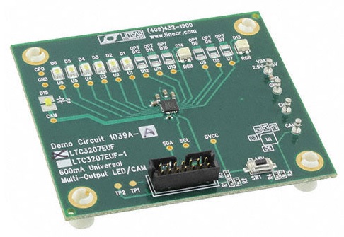 Demonstration circuit 1039 is a 600mA Universal Multi-Output LED/CAM Driver with six white LEDs, two RGB LEDs, and a camera flash featuring the LTC3207/LTC3207-1.