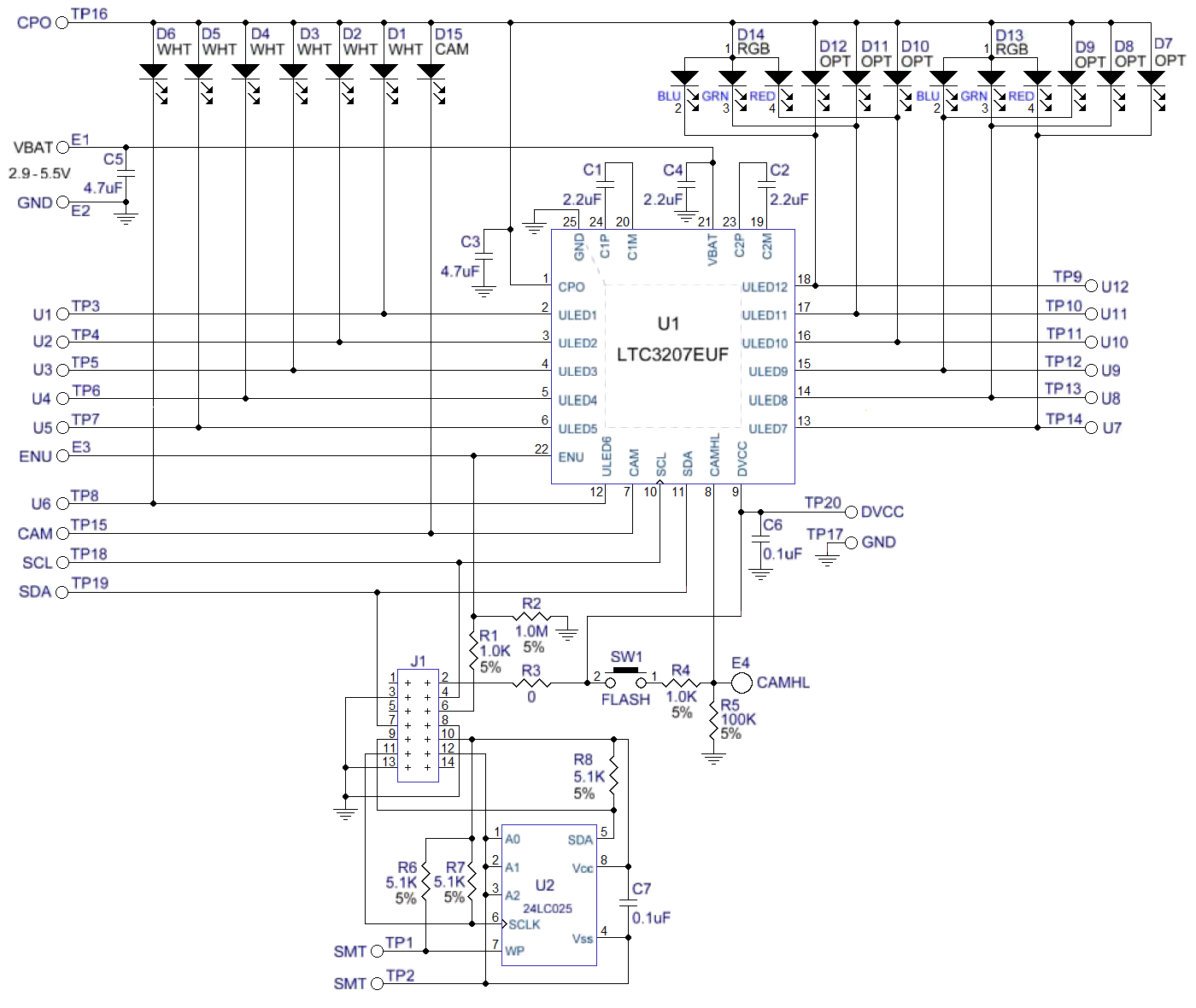 The maximum display currents are set with an internal precision current reference. On/Off blinking, gradation, and intensity are achieved via an I2C serial interface. See the LTC3207/LTC3207-1 data sheet for more information on this process. There are 64 dimming states available for the universal LEDs and 16 dimming states for the camera LED.