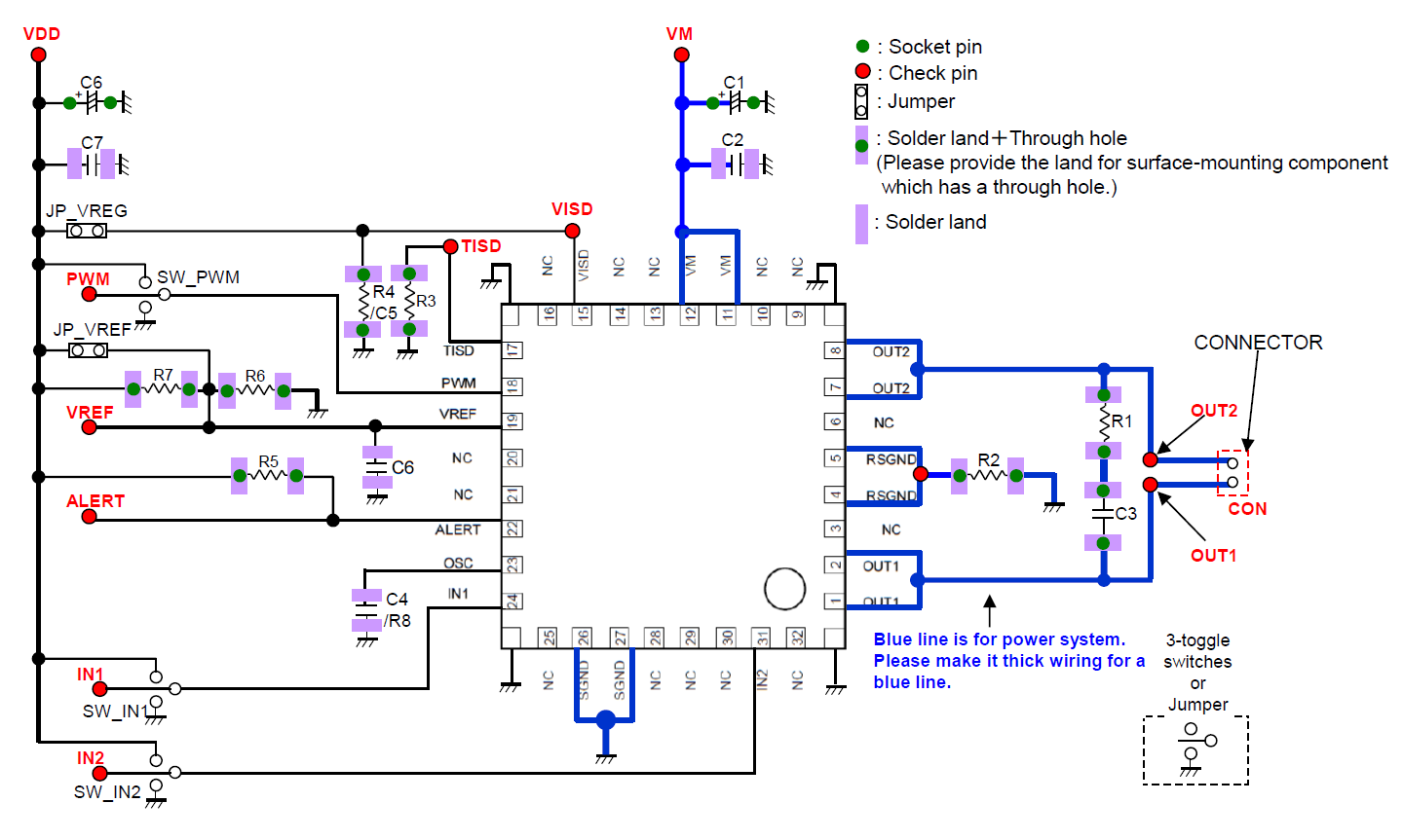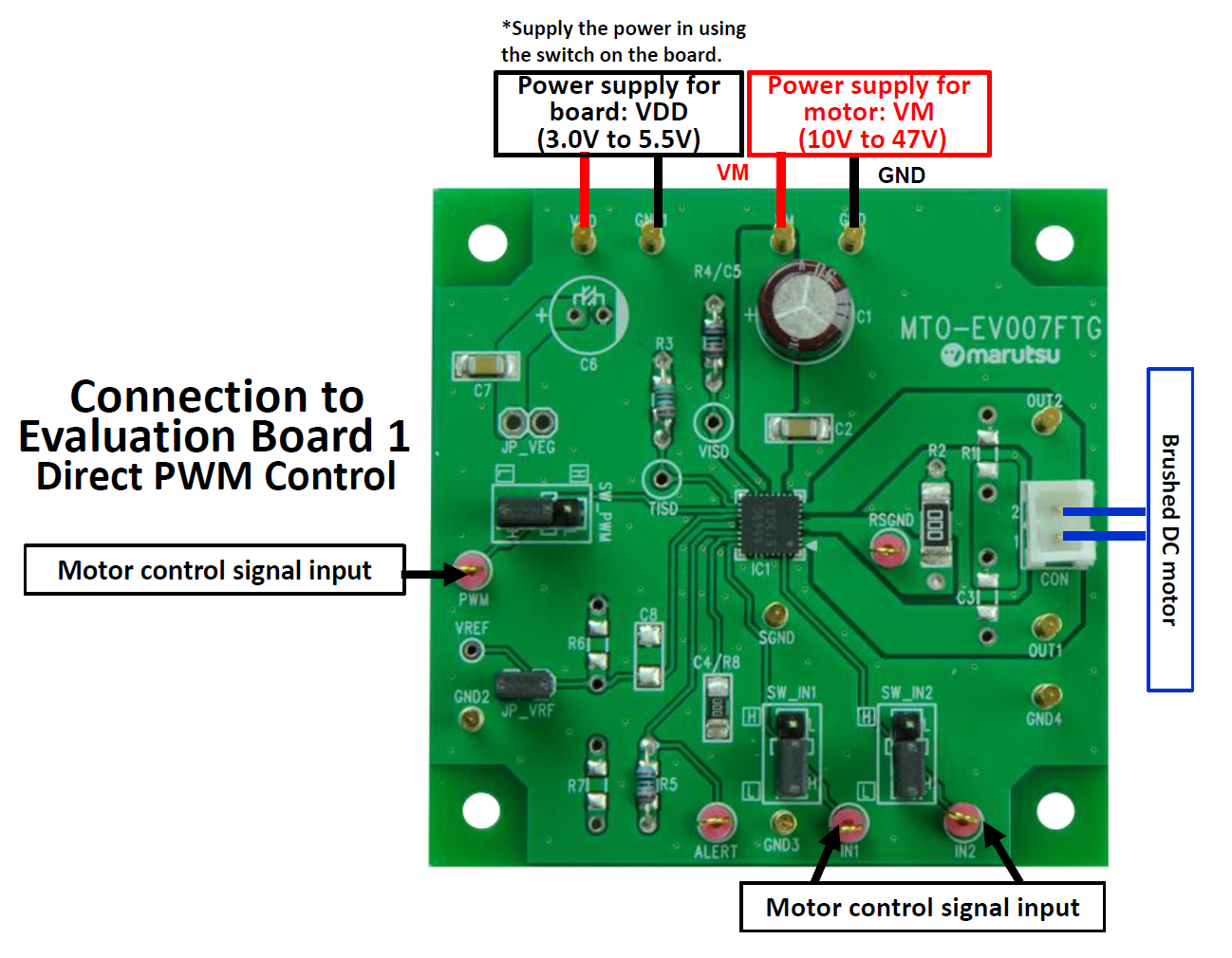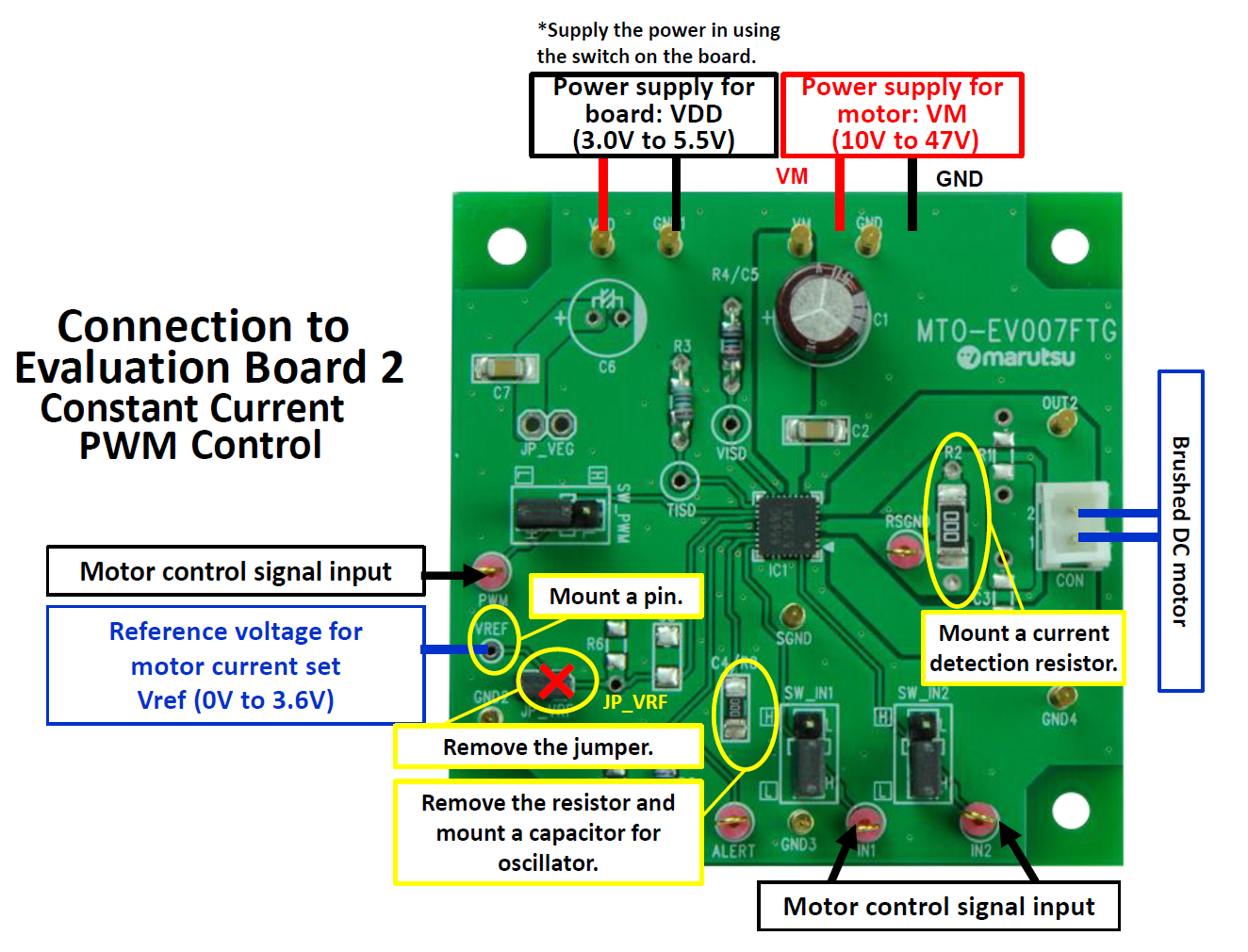 Brushed DC motor can be controlled by the direct PWM drive. In case of controlling the brushed DC motor by the constant current PWM drive, please remove the short resistor (0Ω), which is mounted to R2. Then, replace the current detection resistor that is appropriate for the constant current PWM control.