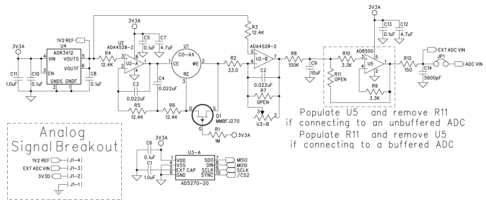 For applications where measuring fractions of ppm gas concentration is important, using the ADA4528-2 and the ADR3412 makes the circuit performance suitable for interfacing with a 16-bit ADC, such as the AD7790.