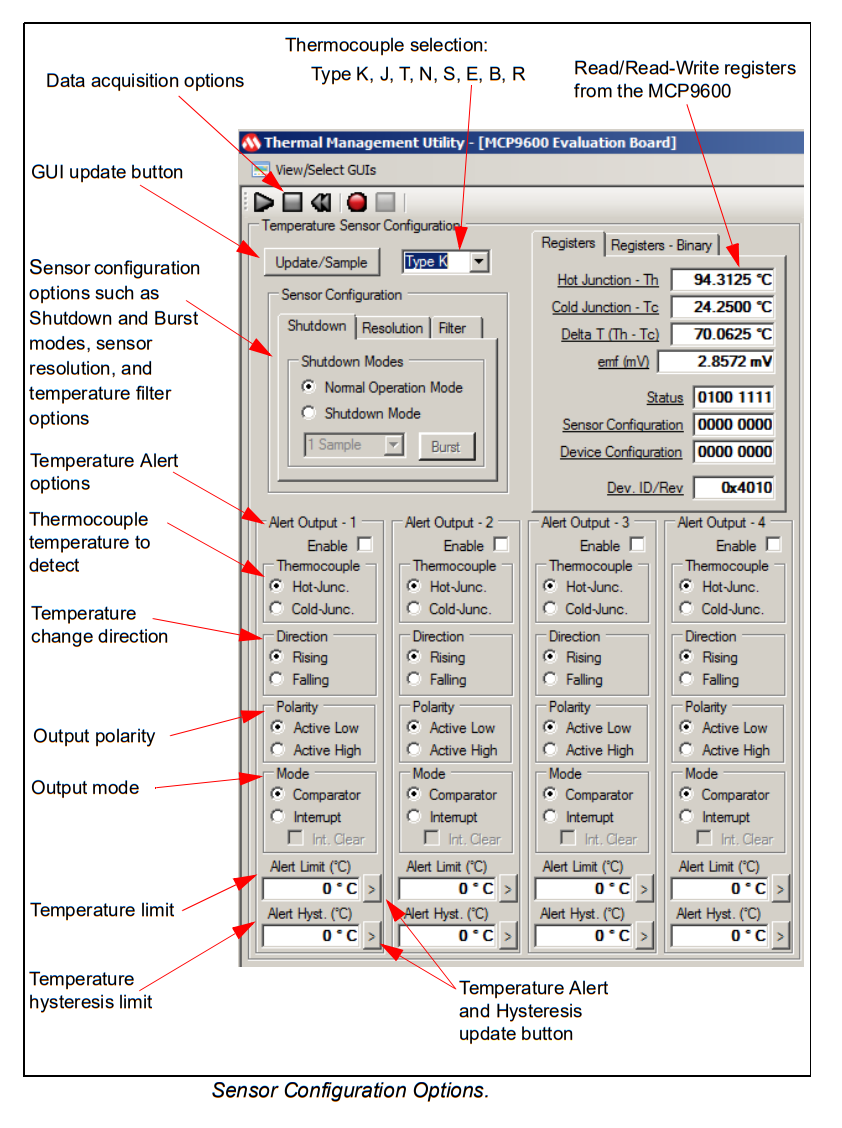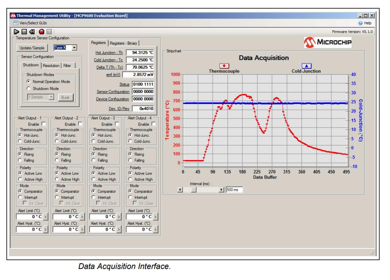 In addition, evaluation board connects to PC via USB interface. Temperature can be data-logged using Microchip Thermal Management Software Graphical User Interface (GUI).