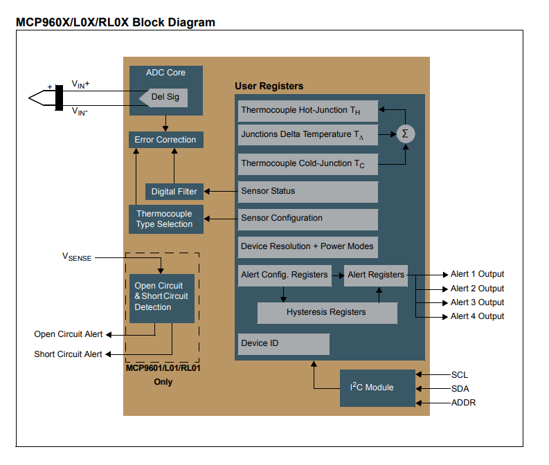The MCP9600 is a Thermocouple Electromotive Force (EMF) to temperature converter. This device converts thermocouple EMF to degree Celsius with integrated Cold-Junction compensation. MCP9600 corrects the thermocouple nonlinear error characteristics of eight thermocouple types and outputs ±1.5°C accurate temperature data for the selected thermocouple. The correction coefficients are derived from the National Institute of Standards and Technology (NIST) ITS-90 Thermocouple Database.