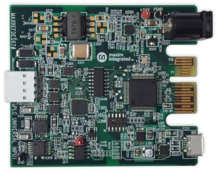 The MAXREFDES67# reference design is a complete universal analog input for industrial applications. This unique 24-bit front-end accepts bipolar voltage and current, resistance temperature detector (RTD) and thermocouple (TC) inputs. Built in Maxim Integrated’s ultra-small Micro PLC form factor, the MAXREFDES67# performs with an effective resolution up to 22.3 bits with temperature error as low as ±0.1% across a range of -40°C to 150°C.