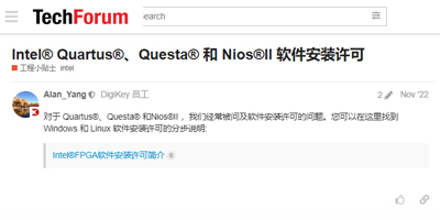 对于 Quartus®、Questa® 和Nios®II ,我们经常被问及软件安装许可的问题。您可以在这里找到Windows 和 Linux 软件安装许可的分步说明: Intel®FPGA软件安装许可简介