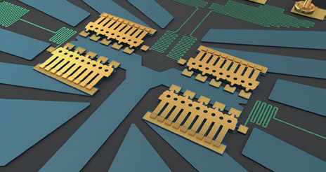 下图1为采用单刀四掷 (ST4T) 多路复用器配置的四个MEMS开关的放大图。每个开关梁有五个并联阻性触点,用以降低开关闭合时的电阻并提高功率处理能力。