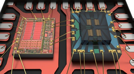 图2,驱动器IC(左)和MEMS开关芯片(右)安装并线焊在金属引线框架上