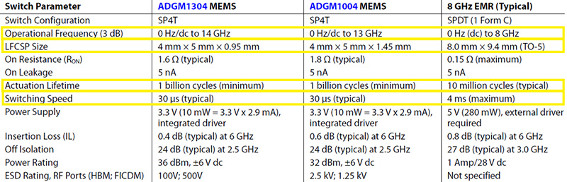 以ADGM1004/ADGM1304 SP4T 系列为例,其各项参数与传统机电继电器比较(图3) 有着不少明显优势。