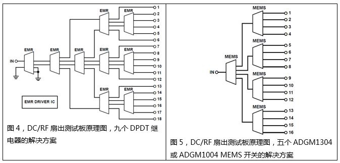 以典型的dc/RF开关扇出16:1多路复用功能为例 (图4),需要九个DPDT EMR继电器和一个继电器驱动器IC,来实现18:1多路复用功能(八个DPDT继电器只能产生14:1多路复用功能)。图5中,显示了相同的扇出开关功能,仅使用五个ADGM1304或ADGM1004SP4T MEMS开关,因而得以简化。