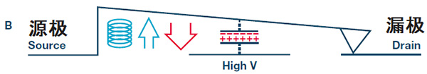 开关采用三端子配置进行连接。功能上可以将这些端子视为源极、栅极和漏极。下图是开关的简化示意图,情况A表示开关处于断开位置。