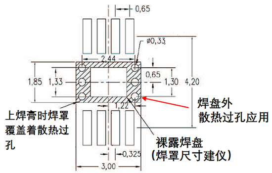 从裸露焊盘的焊盘区域到PCB的另一侧添加散热过孔,可以有效地散热。当中的散热过孔应用可设计于PCB散热焊盘内或焊盘外(即是在铜面上,不掏上焊膏)。图4中的例子中生产商建议散热过孔布设在焊盘外。