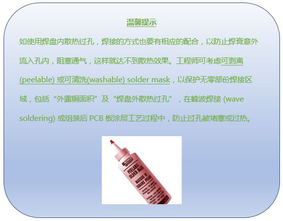 - 可应用焊盘内或焊盘外散热过孔。使用焊盘内散热过孔,工程师可考虑使用可剥离 (peelable) 或可清洗(washable) solder mask,以保护“外露铜面积”及“焊盘外散热过孔”在波峰焊接(wave soldering) 或组装后PCB板涂层工艺过程中,防止过孔被堵塞或过热。