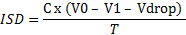电容器 ESR 是另一个影响放电特性的重要参数之一。超级电容器的电压会根据放电电流而下降。由于内阻(ESR)的存在,电压也成比例地下降。这些电压降会影响输出,特别是当电容器用于高放电电流和降低电压时。因此,考虑到电压降,有必要计算所需的特性。可通过以下公式计算。