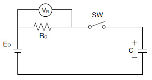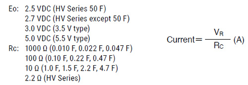 除了部份生产商直接提供参数值外,“漏电流值”可通过向超级电容器施加电压直至特定时间后测量电阻器两端的电压,再根据以下简单方程计算便能得出。