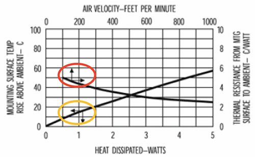 很多时候,你可以从数据表里找到如图2的散热图(Aavid散热器, 590102B03600G) ,大部份生产商将两个不同散热图组合起来以节省空间,每条曲线上会有小箭头指示该曲线对应哪个轴。