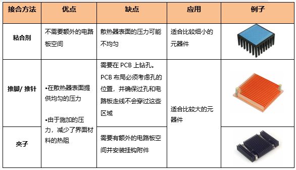 市场上有不同散热片接合方法可供选择。最常用的方法包括:粘合剂、推脚(或推针)和夹子。下表列出了每种接合方法的一些设计注意事项。