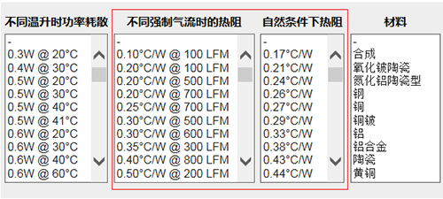 图1,在DigiKey 搜索器可以找到不同散热器的不同强制气流时的热阻和自然条件下的¬¬热阻