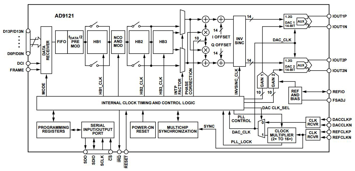 - 通过增益、DC 偏移和相位调节实现边带抑制能力 (AD9121)