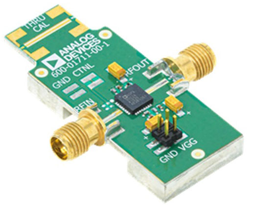 ADPA9002-EVALZ 采用一块双层印刷电路板 (PCB),该电路板由安装铝散热器的 10 mil 厚 Rogers 4350B™ 覆铜制成。散热器有助于为 ADPA9002 散热,并为 PCB 提供机械支撑。散热器上的安装孔支持连接到较大的散热器,以改善热管理。ADPA9002-EVALZ 的 RFIN 和 RFOUT 端口装有 2.9 mm 母头同轴连接器(J1 和 J2),相应的 RF 印制线具有 50 Ω 的特性阻抗。ADPA9002-EVALZ 装有适合在 ADPA9002 的整个 -40°C 至 +85°C 工作温度范围内使用的组件。