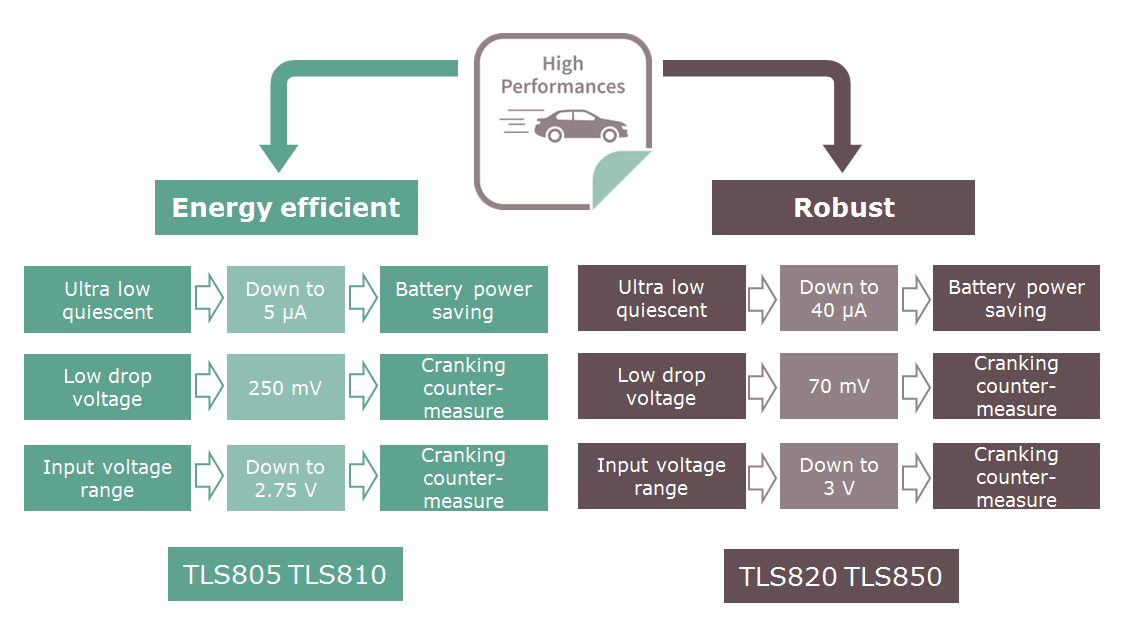 Both families are designed to be operational in harsh automotive environment and implement automotive specific feature sets. To improve further stability and robustness products were designed and tested with LV124 requirements flow, which is unique and helps to improve quality in the field and minimize design effort and cost. Both families are suitable for all battery connected automotive applications and are able to withstand cranking and load dump conditions. With output current options ranging from 50 mA up to 500 mA these products have best in class quiescent current performance making them suitable for body applications ranging from body control modules, HVAC to access control and lighting to supply microcontrollers and transceivers.