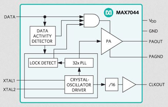 Analog Devices 的 MAX7044、晶体基准式相位锁相环 (PLL)、VHF/UHF 发射器设计用于发射 300 MHz 至 450 MHz 频率范围内的 OOK/ASK 数据。 MAX7044 支持高达 100 kbps 的数据速率,且能够向 50 Ω 负载提供高达 13 dBm 的 输出功率,同时只需 2.7 V、7.7 mA 的输入源。