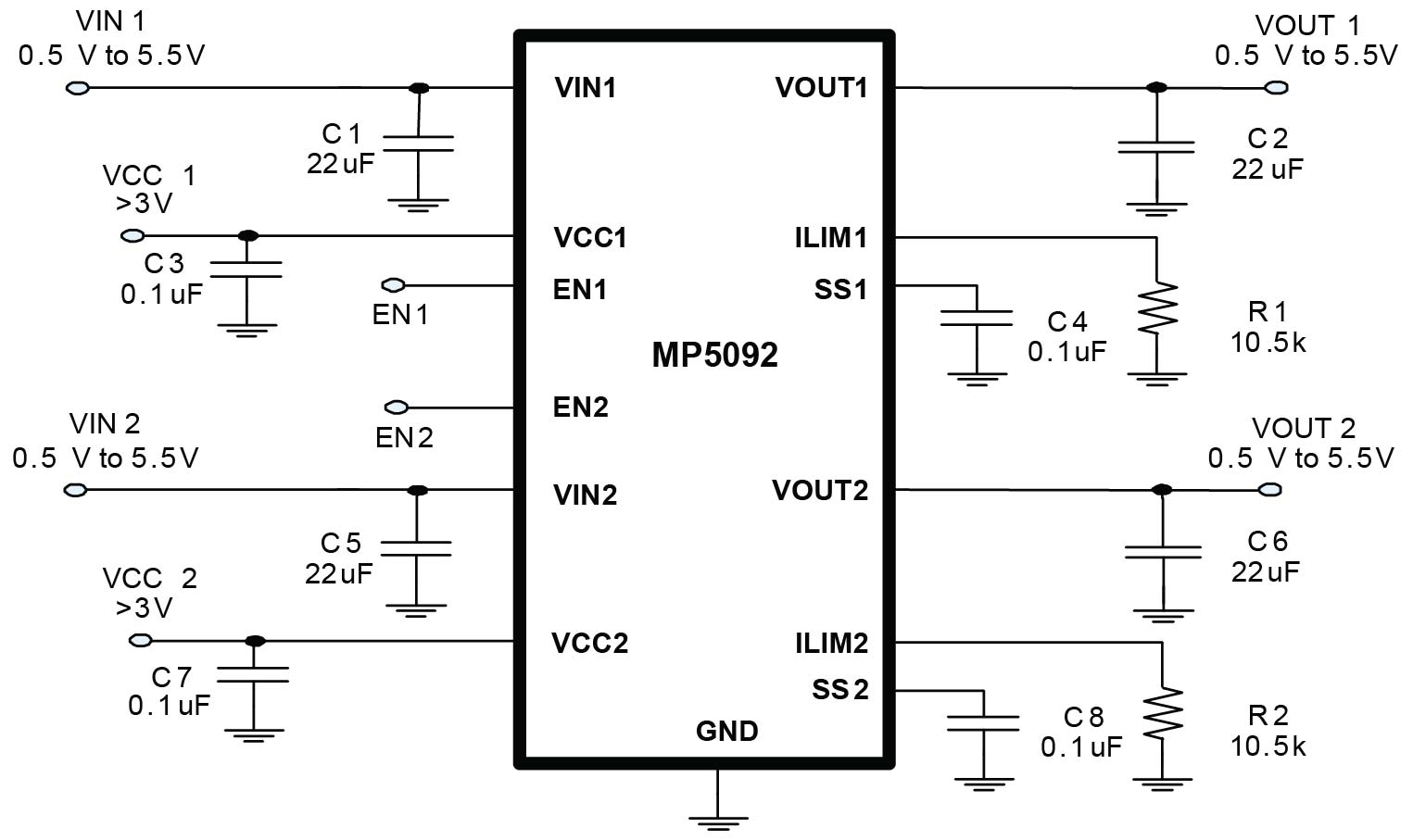MPS' MP5092 integrates dual load switches to provide load protection covering a 0.5 V to 5.5 V voltage range. Every channel can work alone and each channel provides a 7.5 A load capability. With small RDSON in a tiny package, the MP5092 provides a very efficient, space-saving solution for notebooks, tablets, and other portable devices.