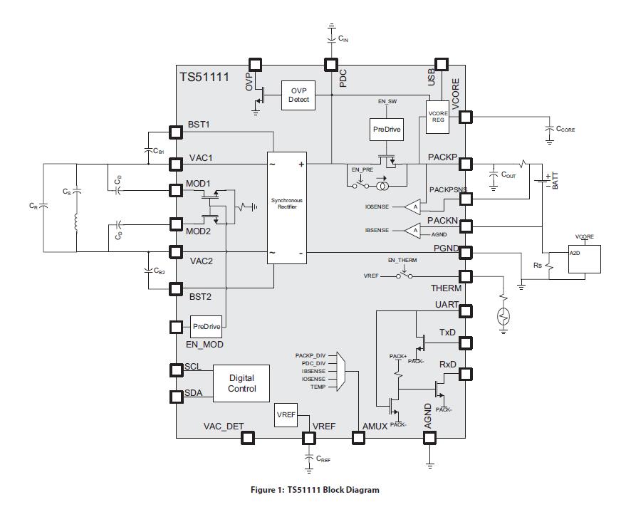 TS51111 包括多个附加模块,可方便地集成到无线电力系统中。 具有零电流关闭模式的集成电阻分压器可实现对 PDC、PACKP、USB 和热敏电阻电压进行外部 ADC 测量。 包含了高压开关,以进行通信调制。 通过集成 LDO 给外部控制器供电。 超低静态电流调节器可在低压差条件下提供高输出电流,并且电池的电流消耗极小。